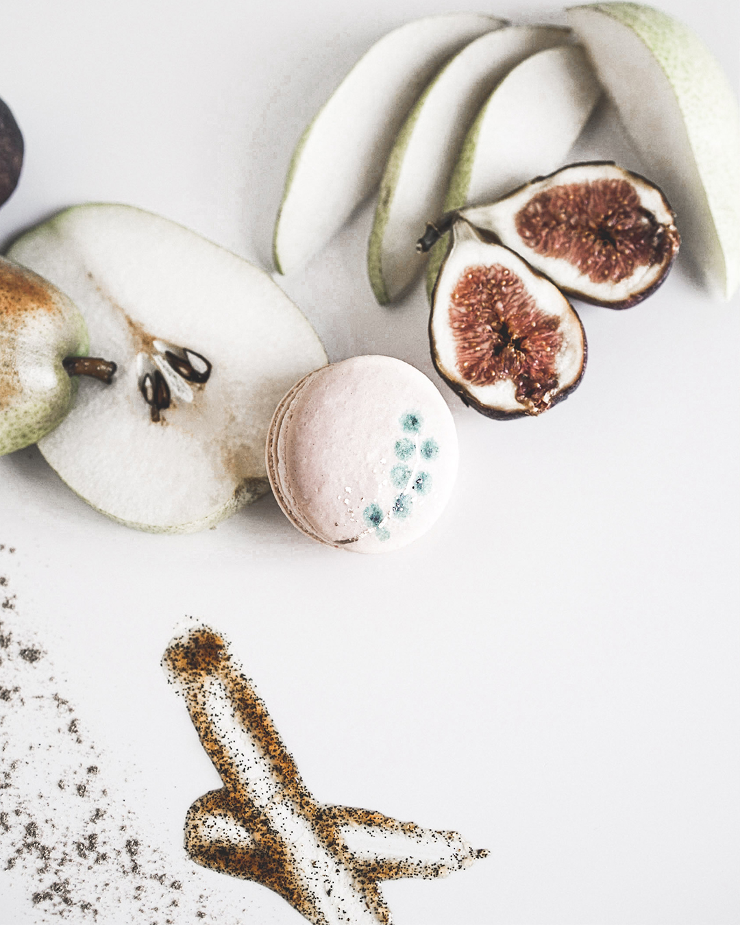 Pear macaron shell with a warm spiced pear + vanilla bean buttercream and fresh fig + cardamon jam center